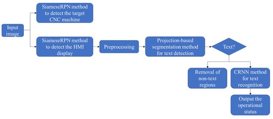 There are three main targets of this research. One is to automatically recognize the target CNC machine in a complex environment through a camera mounted on a moving mobile manipulator. Simultaneously, detect the human-machine interface (HMI) of the CNC machine. Once the HMI is detected, it can identify the working status by recognizing the text on the HMI display. This study proposes a novel deep learning-based approach to achieve these goals. First, the Siamese region proposal network (SiameseRPN) method was proposed to achieve the target CNC machine and HMI detection. Then, the detected HMI images are extracted, pre-processed, and used as inputs for working status recognition. Finally, the novel text recognition method by combining the projection-based segmentation and the convolutional recurrent neural network (CRNN) was developed to identify the working status of the target CNC machine. Figure 1 presents the flowchart of the proposed intelligent manufacturing approach. The following section explains the SiameseRPN method and the machine’s working status recognition method.