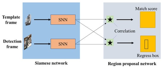 Siamese region proposal network is proposed for the target detection consists of two subnetworks: Siamese neural network and the region proposal network. The framework of SiameseRPN is shown in Figure 2.