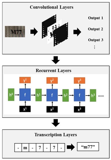 After text detection, CRNN [] is used to recognize the detected text. The framework of CRNN used in this study is shown in Figure 3. It consists of three subnetworks: convolutional layer, recurrent layer, and transcription layer. The convolutional layer automatically extracts feature map sequences from input images. Then the extracted feature sequences are fed into the recurrent network to predict each feature sequence. The transcription layer is used to translate each frame prediction generated in the recurrent layer and group them into a labeled sequence. The main benefit of the CRNN is that it can be trained with one loss function despite being composed of different network architectures.
