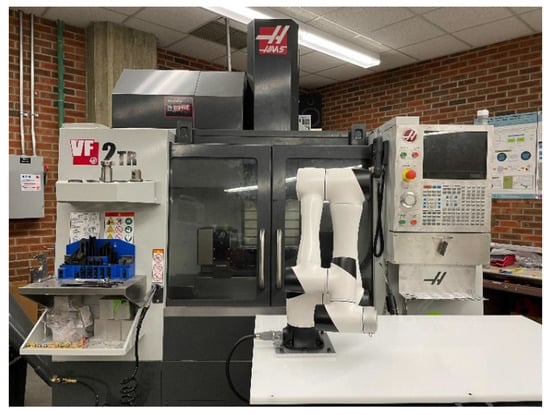 With current labor shortages and high costs, workers’ health, safety, and product quality may be compromised to compensate for manufacturing productivity []. Most manufacturing activities, such as machine tending tasks, are low-tech, repetitive, and dull, so workers can easily be replaced. With the development of robots, they are gradually being applied to machine tending tasks by collaborating with operators and even replacing workers to load and unload the raw parts to the machines. Recently, numerous research and development have been carried out and contributed to the robotic system in smart manufacturing [,,,,,]. Since robots can sense and respond to different scenarios for various manufacturing tasks, collaborative robots (cobots) have been widely implemented to relieve workers from risky, tedious, and repetitive manufacturing tasks []. In addition, it ensures high throughput rates and low costs [].