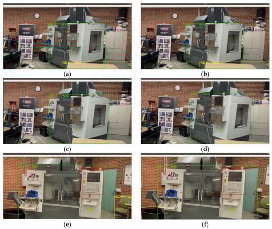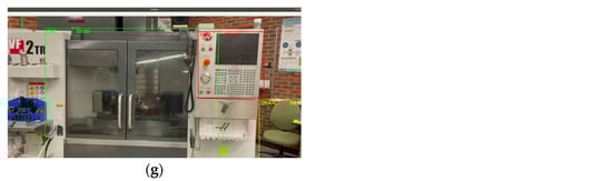 Validation results for the target CNC machine and HMI detection. (a–d) Detect the target CNC machine in the green bounding box, and obstacles such as the table in the yellow bounding box; (e–g) detect the HMI in the red bounding box.