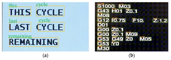 Text recognition examples for recognizing the information on HMI display. (a) Basic instructions recognition; (b) G-code recognition.