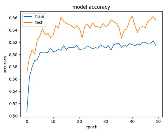 For the HMI detection, the accuracy of the proposed method is shown in Figure 9. The model’s accuracy for training and testing can reach 66.3% and 61.9%, respectively. The performance is acceptable considering the size of the dataset. Different parameter values, such as the batch size of training data, the learning rate of the model, and the activation function, have been applied, but they achieved limited benefit. Therefore, increasing the training dataset size would be better to improve the models’ performance.