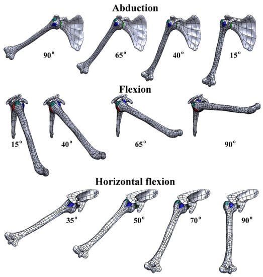 To our knowledge, only a few biomechanical studies has been investigated in GT-fracture-treated shoulders involving rotator cuff muscles that affect rehabilitation activities [,,]. Mihata et al. found greater biomechanical effects at a high shoulder abduction position for the conventional double-row technique and at low abduction angles for the bridging sutures technique in their studies []. Lin et al. resulted that the fixation techniques of double row suture anchor and suture bridge had superior initial fixation strengths at a low and high abduction angles, respectively, whereas the screw fixation technique was unaffected in their humeral GT fracture treatment study []. However, these studies were limited to only abduction movements for various angles of the humerus in their analyses. After surgery, the biomechanical properties of the repaired GT fragment were influenced by shoulder positions and activities, because the load on the GT fragment varies with shoulder positions and activities. Thus, the present study considered three types of shoulder rehabilitation activities including abduction, flexion, and horizontal flexion for various positions [].