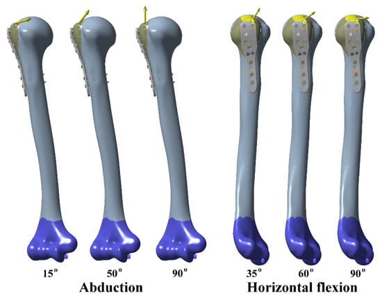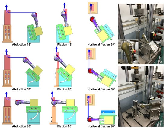 Artificial medium-sized fourth-generation composite humeri (Sawbones, Pacific Research Laboratories, Inc., Vashon, WA, USA) were used for the mechanical experiments. Artificial humeral bones enable more accurate comparisons of biomechanical properties because their geometries and material properties are more consistent with human bones. A GT fracture was recreated in the artificial humerus using a reciprocating saw with a thin blade and a fracture was repaired using a titanium locking plate and locking screws. The geometry and size of the fixation implant were similar to those used in our finite element model. The plate bone construct was positioned in the custom-made fixture, specially designed based on previous studies from literature for mechanical testing [,]. The tensile force simulating the supraspinatus and infraspinatus muscle tension on the greater tuberosity was applied to the GT fracture fragment by a servo-hydraulic material testing machine (model 8872; Instron Industrial Products Group, Grove City, PA, USA) through a stainless steel cable (Figure 3). This setup was designed to be adjustable, so the traction force direction can be changed for different abduction, flexion, and horizontal flexion positions. The plate bone construct positions of 15, 50, and 90° for abduction and flexion motions and the positions of 35, 60, and 90° for horizontal flexion motion were considered and experimented on. The static loading tests were conducted by applying a tensile ramp-up load with a loading rate of 1 mm/min in displacement control mode and the tests were terminated when the displacement of the actuator reached 5 mm. The test was repeated six times for each condition. The load–displacement curve of different configurations was recorded, and stiffness of each specimen was calculated.