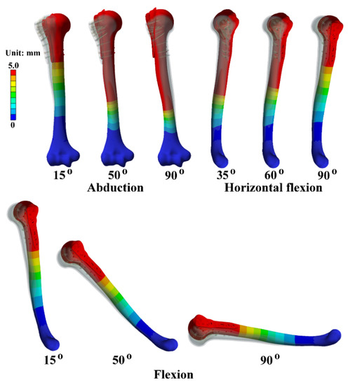 The finite element model of the humerus bone with the locking plate was analyzed successfully and its results were converged properly after the convergence analysis. Under loading, the humerus underwent flexural deformation at 15° abduction motion, and gradually transitioned to axial deformation as the abduction angle increased to 50 and 90°. For all the positions of flexion, the humerus resulted the same deformation because the direction of the traction load to the humerus was kept at 90°. For the horizontal flexion motion, the humerus underwent axial deformation at the 35° position, and gradually transitioned to flexural deformation as the position increased to 50, 70, and 90° (Figure 5). The stiffness of the model was calculated from the reaction force and maximum deformation in the numerical analysis. For the abduction motion, the stiffness of the model was 225 N/mm at the 15° position and increased to 1874 and 2917 N/mm at the 50 and 90° positions, respectively, whereas it was 1165 N/mm at the 35° position and reduced to 771 and 127 N/mm at the 60 and 90° positions, respectively, for horizontal flexion motion. Since the traction load was perpendicular to the humerus in all flexion motions, a stiffness of 127 N/mm was found to be the same in all positions, equal to 90∘ horizontal flexion positions.