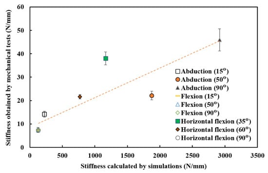 The stiffness results of finite element models were analyzed and validated using biomechanical experiments. The stiffness of plate bone constructs was calculated from the linear portion of the load displacement curve. In the static load case, the stiffness of the plate bone construct was 14.2 N/mm at the 15° position and 22.2 N/mm and 45.9 N/mm at both the 50° and 90° positions for abduction motion, respectively. Stiffness was relatively high when the loading direction was approximately along the humeral axis, but relatively low when it was perpendicular to it significantly (p < 0.05). In horizontal flexion motion, the construct had a stiffness of 38 N/mm at 35° position and reduced to 21.6 N/mm and 7.4 N/mm at 60° and 90° positions respectively. Loading approximately along the humeral axis produced relatively small stiffness, but loading perpendicular to it produced relatively high stiffness significantly (p < 0.05). The stiffness was 7.4 N/mm for all the positions of flexion movements and was lower significantly (p < 0.05) than those of abduction and horizontal flexion motion. The mechanical test results under different motions were closely correlated with computer numerical simulation results with a high correlation coefficient of 0.88 (Figure 6).