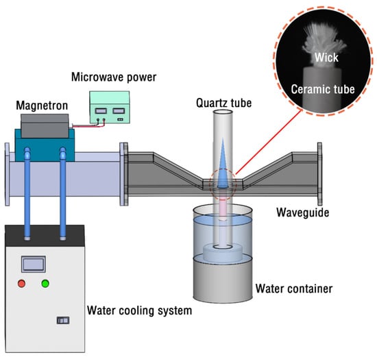 Figure 1 shows a schematic view of the water vapor microwave plasma system. It consists of the 2.45 GHz microwave generator, waveguide components, water container, ceramic tube, and wick. The microwave power supply provides a maximum power of 1000 W and is connected to a magnetron (LG, M246, Seoul, South Korea) to generate microwaves. The water-cooling system is a circulating water tank to prevent the microwave generator from overheating. The waveguide cavity is composed of a rectangular waveguide (WR340) and a dual-port tapered waveguide. The quartz tube is vertically inserted into the opening of the upper and lower surfaces of the dual-port conical waveguide. It is directly connected with the water container to guide and generate a plasma torch. The quartz tube has an inner diameter of 24 mm, an outer diameter of 28 mm, and a length of 600 mm. The ceramic tube is placed inside the quartz tube, its lower end is fixed at the bottom of the water container, and its upper end is in the center of the dual-port tapered waveguide. The main component of ceramics is silicon dioxide, which is produced from pressed powder material. The dielectric permittivity of the ceramic tube is 3.86, and its melting temperature is about 1200 °C. The wick is placed inside the ceramic tube, partially exposing the nozzle. The characteristics of water vapor microwave plasma are detected by the infrared thermometer (Guide infrared, PS400, Wuhan, China) with a high-temperature lens (GD-20), a high-speed camera (Phantom, V1612, Dallas, TX, USA) matching with a microscopic zoom lens (Navitar 12-X), a high-definition camera (Sony, A7M3, Tokyo, Japan), and optical emission spectroscopy (Ocean Optics, HR4000CG-UV-NIR spectrometer, Orlando, FL, USA).