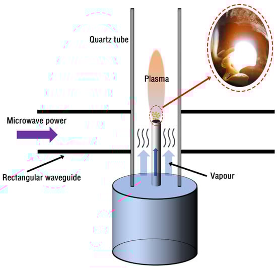 Non-thermal plasma is a weakly ionized plasma that can work at room temperature and atmospheric pressure while still producing highly active species and electrons. The electronic energy works well to excite molecular and atomic species and destroy chemical bonds, so the non-thermal plasma is widely used in various applications, such as surface modification [,], air-cleaning [] and assisted combustion [], etc. When water vapor is used as the supporting gas of atmospheric pressure non-thermal plasma, it can produce reducing and oxidizing free radicals such as H, OH, and O so that the plasma can more effectively treat various hydrogen-rich compounds such as methane, natural gas, ethanol, and coal and use them as raw materials to produce hydrogen [,,,,,,]. The commonly used atmospheric pressure non-thermal plasma sources include glow discharge, corona discharge, dielectric barrier discharge (DBD), radio frequency (RF) discharge, and microwave discharge [,,]. Among these plasma sources, the microwave discharge is used to generate water vapor plasma, which has many advantages, because the strong interaction between 2.45 GHz microwave and water molecules can produce higher electron temperature and higher plasma density, realize high-level dissociation, and realize high-efficiency microwave power transmission from the microwave generator to the plasma [,,,]. For example, Canadian researchers have studied a method based on a microwave plasma source, which uses microwaves to generate plasma to decompose water vapor into hydrogen. The energy efficiency can reach 53% [].