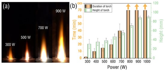 Images of the plasma torch are shown in Figure 3a for when the water vapor is heated and evaporated, reaches the center of the waveguide and is excited. The figure shows the torch images under 300, 500, 700, and 900 W microwave power, respectively. It can be seen that the brightness and height of the torch increase with the increase in power. Figure 3b shows in detail the variation of the height and duration of the plasma torch with power. It can be seen here that the minimum excitation power of the torch is 300 W, and its torch height is 25 mm. With the increase in power, its height can reach 90 mm at 1000 W. It can also be seen from the figure that the duration of the flare is different under different powers. When the power is 300 W, the duration is only 2 min. With the increase in power by 800 W, it can be continuously and stably excited and no longer extinguished. The reason is that when the microwave power is low, the evaporation of water is too small to provide enough free radicals to excite the plasma torch continuously and stably.