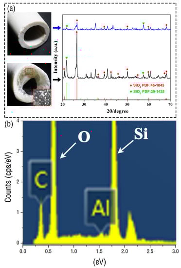 After the top of the ceramic tube is discharged, the image of the ceramic tube before and after discharge is compared and analyzed. It can be found that the molten part on the top becomes very transparent. An XRD analysis of the ceramics can be seen in Figure 5a. The results show that the ceramics have a similar structure before and after discharge. To further explore the composition of the ceramic, we analyzed the ceramic material by energy dispersive spectroscopy (EDS) and found that the main elements are Si and O. Therefore, it can be found that the peak intensity of SiO2 after discharge is significantly stronger than that before discharge, which indicates that the high temperature generated by discharge can promote the crystallinity of the crystal. Finally, we also carried out experiments with alumina ceramic tubes and obtained similar results, which shows that this device can also be used for the crystal growth of non-metallic materials.
