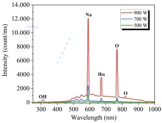 For different values of plasma input power, the emission spectrum of water vapor plasma of the device is obtained in the wavelength range of 250 to 1000 nm. The two-second integration time is applied, and the software PLASUA SpecLine (ver. 2.1, Plasus SpecLine, Kissing, Germany) is used to analyze and allocate the emission line. Shown in Figure 6 are the emission spectra of water vapor microwave plasma obtained by excitation at three different microwave powers of 900, 700, and 500 W, respectively. It illustrates that with the increase in power, the peak value of the spectrum is enhanced, and the emission line increases gradually. In this spectrum, the OH band is clearly identified with intense peaks in the range 302.1–308.9 nm []. Hα at 656.3 nm is also clearly identified []. In particular, the atomic oxygen line at 777 nm and 844 nm was remarkably enhanced. The strongest spectral line with a peak at 589.59 nm in the spectrum is most likely Na [], which mainly comes from Na ions in water. In short, the emission spectrum confirms the dissociation of water molecules.