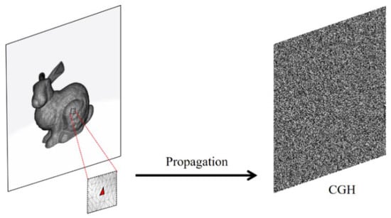 With the rapid development of display and computer technology, 3D display technology has made great progress [,]. The current 3D display technologies generally include binocular parallax display [], volume 3D display [], light field display [] and holographic 3D display. Holographic 3D display is a technology to reconstruct 3D wave-front by using light wave diffraction information based on the principle of wave optics. Because the wave-front information of the 3D scene is reconstructed, it can provide all the depth cues required by the human eye [,,]. The wave-front recording process of holography can be completed and simulated by a computer to generate the so-called computer-generated holograms (CGHs). The use of CGHs avoids the setup of complicated optical paths in optical holography [,], as long as the mathematical description of the 3D scene is obtained and transformed into the wave-front distribution in the hologram plane by algorithms. Therefore, the algorithm of calculating CGHs is key, because it directly determines the computational efficiency of the hologram and the quality of the reconstructed image [,].