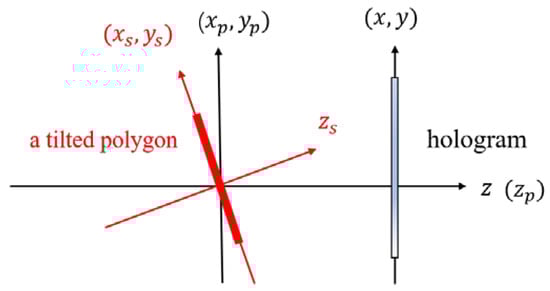 In Figure A1a, we show tilted triangle in the global coordinate system. In Figure A1b, we represent as a collection of discrete parallel planes . has a length of as shown in Figure A1b. The spectrum of can be expressed as = Therefore, the spectrum of in the hologram plane is = . Hence, the spectrum of in the hologram plane can be written as: