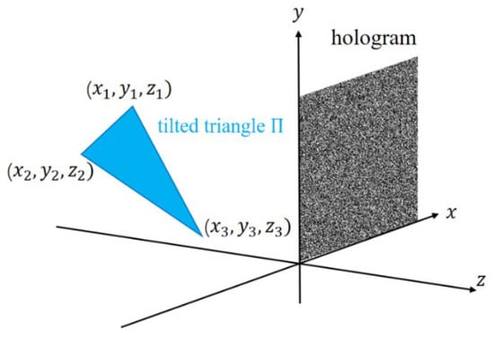 In the traditional 3D affine transformation algorithm, there is a global coordinate system as the output coordinate system, as shown in Figure 3. The hologram plane is located in , and the tilted triangle with vertexes and is located in the global coordinate system.
