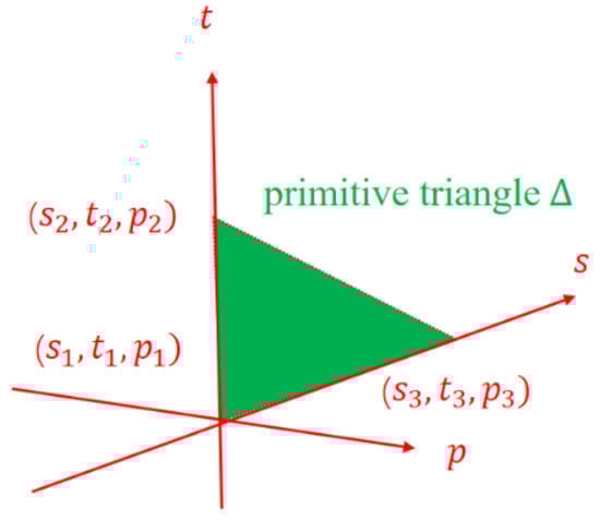 Through simple calculations, we can obtain , indicating the existence of the inverse matrix of Then, we can find the affine transformation matrix by . Note that the vertex only represents a point located in the primitive coordinate system independent of the primitive triangle, and the value of and must be chosen such that to make sure the inverse of exists. can take any value; different values of make a different affine transformation matrix and the Jacobian determinant also changes at the same time. Again, we have chosen Equation (8) for ease of calculations and there is no effect on the final results that we end up solving. According to the above discussion, the affine transformation matrix can be obtained by Equation (7):