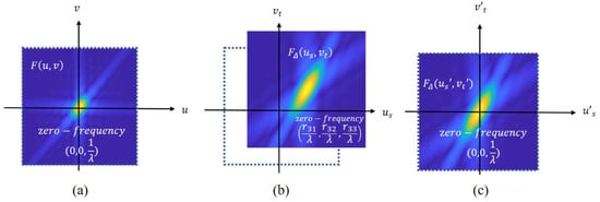 As shown in Figure 5a, the zero frequency in the global coordinate system is . According to the spatial frequency relationship given by Equation (28) in Appendix C, as shown in Figure 5b, the zero frequency in the affine coordinate system is :
