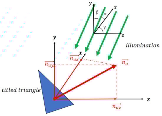 The surface function usually refers to the strength information, and the amplitude is expressed as The surface function of the titled triangle is a constant for each tilted triangle according to Equation (17), so that we can let (I is a constant here) and by using the property of Fourier transform: the spectrum in the hologram of a tilted triangle with added flat shading and the elimination of the “offset” is based on Equation (12), together with Equation (15), we have: