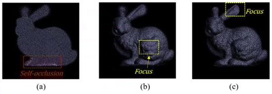 Figure 7 shows the numerical reconstructions of the bunny based on our proposed F3DAAT method. Figure 7a is the result of calculating Equation (12), and we can see that because the amplitude of each mesh is the same constant the reconstruction result is a lack of realism. Additionally, the bunny has self-occlusion, so that back-face culling by judging normal will have some errors for some polygons. Due to the wrong judgment, visible polygons and invisible polygons are superimposed together and the reconstructed part of the image is shown in the red box on Figure 7a. Figure 7b,c are the reconstruction results based on Equation (18), and from these two reconstructed images we can clearly see the details of various parts of the bunny. Figure 7b focuses on the bunny’s leg, shown in the yellow box, and Figure 7c focuses on the bunny’s ear, shown in the yellow box.