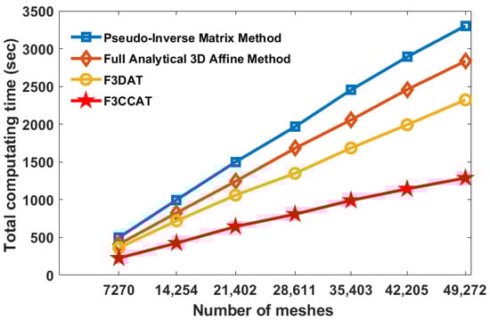 The Stanford bunny consisting of 31,724 meshes (after back-face culling) takes 893 s for the calculation, and the calculation of “Alex” of 49,272 meshes takes about 1288 s (See Figure 9). Additionally, shown in Figure 9 where we have used “Alex”, we can see that the computational efficiency of F3DAAT has increased by almost two times compared with the previous methods. The calculation of the four methods is based on the same hardware condition and only CPU is used for the calculation. In one of the most recent studies, Wang et al. [] proposed a polygon-based method using LUTs (look-up tables) with principal component analysis to speed up the calculation of CGHs. However, the method in the process of pre-computing the affine matrix still needs to solve a pseudo inverse matrix, and our proposed method is more general and efficient for solving the mapping relationship between the two coordinate systems, the global and the affine coordinate systems.