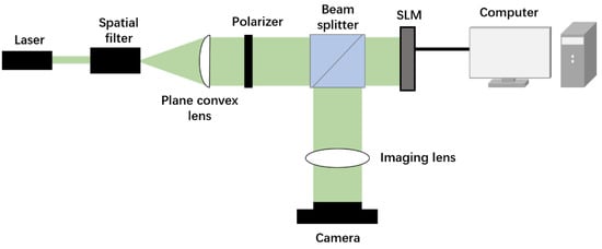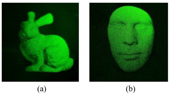 The optical experiment is shown in Figure 10. We have reconstructed 3D objects by loading the phase of the CGHs from the computer onto the spatial light modulator (SLM). The SLM in our experiment is a HOLOEYE PLUTO2 (NIR-011) phase-only SLM with a resolution of 1920 × 1080 (Full HD 1080p) and a pixel pitch of 8 μm and the active area is 15.36 mm × 8.64 mm. The laser is a green light with a wavelength of 532 nm. The spatial filter is used to generate a collimated light for the illumination of the hologram. The polarizer is for adjusting the polarization state of the light to work with the phase-only SLM. A camera (MMRY UC900C Charge-coupled Device) is used to receive the reconstructed image in the image plane of the imaging lens (focal length is 150 mm). Optical reconstructions of the bunny and the face of “Alex” are shown in Figure 11a,b, respectively.