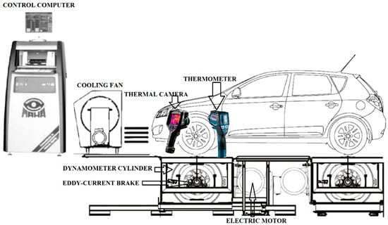 After determining the impact of the brake components used on the braking characteristics of a vehicle, the measurement of the temperature of brake discs during repeated braking was performed. To avoid a distortion of the results by the environment, the measurements were performed under laboratory conditions on the MAHA MSR 1050 dynamometer. The air temperature in the laboratory varied from 18 °C to 22 °C. Prior to each measurement with changed brake components, the vehicle was left for at least 6 h without any motion to reduce the wheel’s hub, brake calliper, brake cylinder and the other components to an ambient temperature to avoid a distortion of the results.