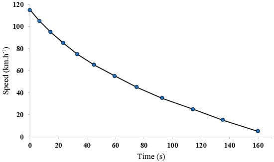 Derived from Equations (2) and (3), the initial speed of braking was calculated as v1 = 103.9 km.h−1, and, from this speed to the zero speed, the time of braking was derived from Equation (4) t = 5.56 s.