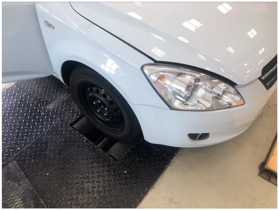 Prior to measurements, a 5 km long route with particular brake components was driven each time, during which braking was performed continuously. There were 8 measurements performed with the low-priced, mid-priced and high-priced brake components at an initial driving speed of approximately 50 km.h−1. Then, the results were averaged. The driver accelerated the vehicle to the speed of 50 km.h−1, and when the front part of the vehicle reached the beginning of the braking section signposted by a traffic cone, the accelerator pedal was released as fast as possible and the brake pedal was applied. The same effort to control the steering affecting the brake pedal was controlled by a Corsys pedometer during all the measurements (Figure 4).