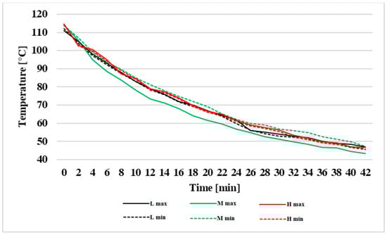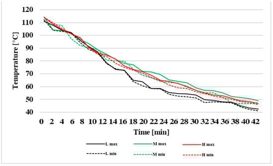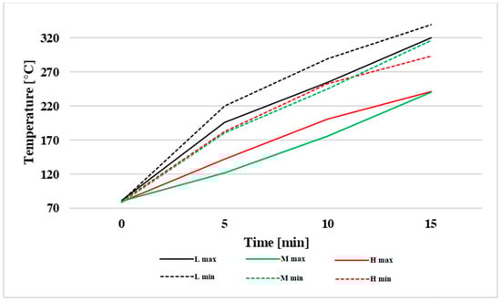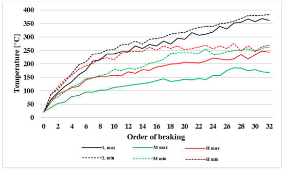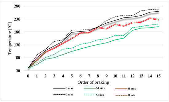 If the temperature of brakes is too high, it is evinced by unpleasant odour, emission of dangerous volatile substances, overheating of the wheel guards, damaging of rubber seals as well as several other activities as also mentioned in the publications [,,]. Publication [] specifies that exceeding the temperature of brake discs from about 165 °C to 190 °C leads to a four- to six-fold increase in emission production of ultrafine particles.