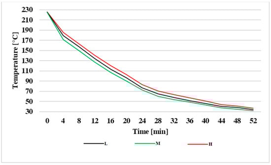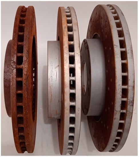 An important characteristic of brake discs is their resistance level against corrosion, which is also observed in the publications [,,]. Corrosion on the friction surfaces of brake discs can cause an excessive increase in the temperature of brake discs and brake pads, as well as a reduction in the coefficient of friction, resulting in the reduction in braking force and lengthening of stopping distance []. The publication [] focused on the impact of corrosion on a vehicle’s braking characteristics, although the constituent material of brake discs was the same.