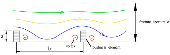 Snow put forward the LCL (local cubic law) through simulation experiment of water flow in smooth parallel plates and found that the discharge through fracture cross-section was proportional to third power of the fracture aperture []. LCL was based on a smooth parallel plates model, and an important parameter, the roughness of fracture wall surface, was not taken into consideration. There is no ideal smooth fracture in the nature, and the existence of roughness elements on fracture wall surface will narrow down the passage of water (Figure 1). Therefore, in practical applications, LCL often overestimated the seepage capacity of rough fracture [,]. The real fracture surface is generally rough and uneven, and the aperture also changes randomly at different positions in fracture, so the concepts of hydraulic fracture aperture eh, average fracture aperture , and mechanical fracture aperture em were introduced. Hydraulic fracture aperture eh was also called equivalent hydraulic fracture aperture, which was an inference value, i.e., the rough fracture was equivalent to a smooth parallel plates fracture with aperture eh, and its value could be calculated according to LCL after the flow of the rough fracture was measured; the average aperture  was the average value of the fracture apertures along the fracture; the mechanical fracture aperture em referred to the maximum closing deformation value of the two surfaces of fracture.