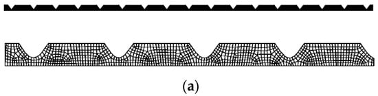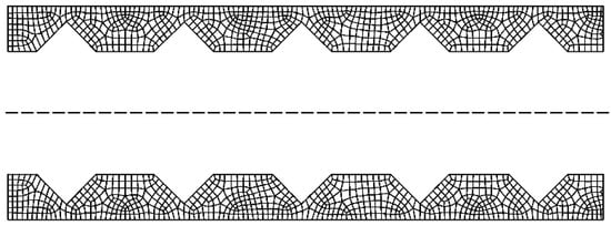 Grid scale is a problem that should be paid attention to in the research. It is not appropriate to be too large or too small. When the grid size is too big, it will cause loss of simulation accuracy. The minimum fracture aperture is 3 mm, the roughness element height is 1 mm, and the minimum roughness element spacing is 4 mm, so the grid size should be much less than 1 mm. However, if the grid size is too small, calculation time would increase dramatically. Thus, in this study, the grid size selected 0.2 × 0.2 mm. The grid size was much smaller than 1 mm (roughness element height), so the influence of grid size on the flow field could be ignored. The model and grid division structure are shown in Figure 3, Figure 4 and Figure 5 [].