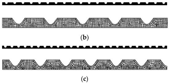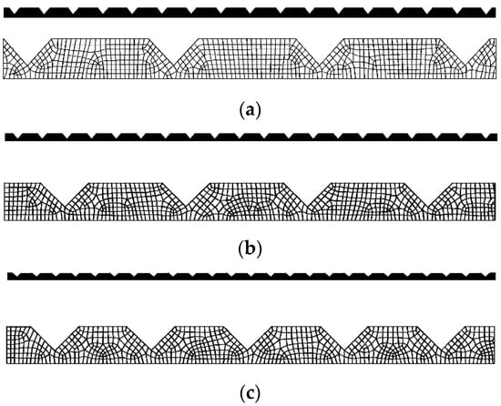 2D model and grid structure diagram of single fracture with triangular roughness elements and different densities: (a) A = 6, (b) A = 5, and (c) A = 4. In each figure, the upper black part is the schematic diagram of fracture rough surface, and the lower part is the diagram of fracture local roughness element and grid structure.