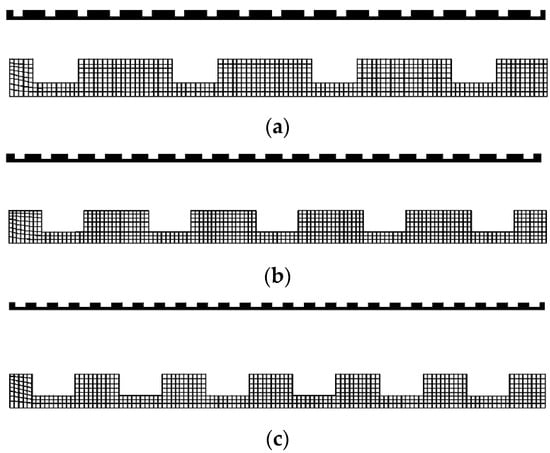 2D model and grid structure diagram of single fracture with rectangular roughness elements and different densities: (a) A = 6, (b) A = 5, and (c) A = 4. In each figure, the upper black part is the schematic diagram of fracture rough surface, and the lower part is the diagram of fracture local roughness element and grid structure.