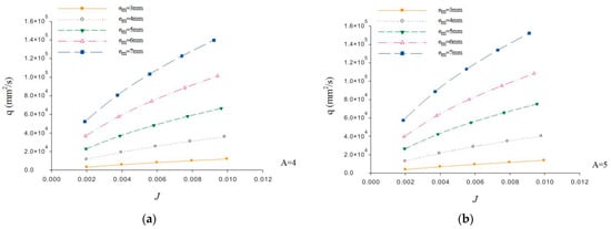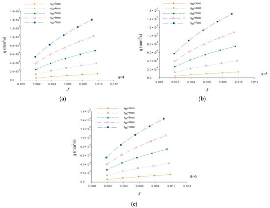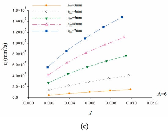 When studying the fracture aperture index n, the change of average fracture aperture  affects the value of relative roughness (negative correlation, the increase/decrease of the former will cause the decrease/increase of the latter), and the change of roughness density A essentially causes the change of relative roughness (positive correlation, the former and the latter increase and decrease at the same time), so it is impossible to qualitatively describe the effect of the change of roughness density A on the fracture aperture index n by controlling variables. This is also verified by the relation between the ratio q/Jm of discharge per unit width to hydraulic gradient and average fracture aperture  in Figure 10: although they increase together on the whole, the increasing trend is difficult to quantify.
