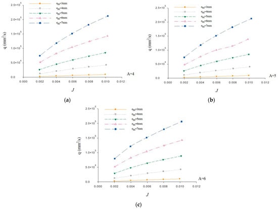 The relations between discharge per unit width q and hydraulic gradient J in fractures with triangular roughness elements of different densities (a) A = 6, (b) A = 5, and (c) A = 4.
