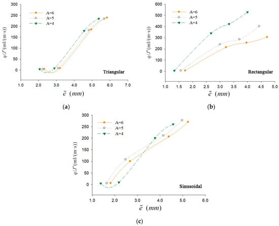 The relation curves between q/Jm and average aperture  in fractures with (a) triangular, (b) rectangular and (c) sinusoidal roughness elements. The ordinate unit can be converted as follows: ml/(m·s) = cm3/(m·s) = (10 mm)3/(m·s) = 1000 mm3/(1000 mm·s) = mm2/s.