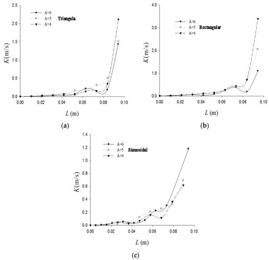 As shown in Figure 11, the K-L relation diagrams under the conditions of different densities and shapes of roughness elements are drawn respectively. It can be seen that the farther away from the inlet, the greater the permeability coefficient, which indirectly proves that the permeability coefficient K has a scale effect. The closer to the outlet, the faster the K value increases. The roughness elements with different shapes have similar variation trends. In the same shape of roughness element fracture medium, with the increase of roughness element density, the influence of roughness element density on the permeability coefficient K becomes greater. It can also be seen from Table 4 that, in the data corresponding to the triangle roughness element fracture, when the density value A is 6, the correlation coefficient is 0.417, when A is 5, the coefficient increases to 0.577, and when A is 4, the coefficient decreases to 0.404; in the rectangular roughness element, when A is 6, the correlation coefficient is 0.542, and when A is 5 and 4, the corresponding correlation coefficients are 0.562 and 0.458, respectively. In the sinusoidal roughness element fracture, the correlation coefficient corresponding to A of 6 is 0.623, and the correlation coefficients corresponding to A of 5 and 4 are 0.790 and 0.708, respectively.