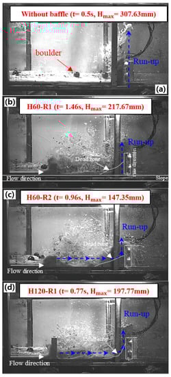 Figure 4 shows a comparison between the observed kinematics captured at the maximum run-up using the high-speed camera for each test. As shown in Figure 4, the flow piled up to form a gradual increase in dead zones behind baffles, after which the flow was deflected upwards along the surface of the rigid barrier. In each experiment, the arrival time for the maximum run-up height ranged from 0.50 to 1.46 s (time from entering the baffles to the maximum run-up height at the rigid barrier), and the maximum run-up height was significantly different according to the presence of baffles. In Figure 4a, because of the absence of the interference of baffles, the maximum run-up height was observed, which was much higher than the height of the rigid barrier. In Figure 4b–e, with the baffle arrays, the flow was affected by the first and second rows of baffles, and then the flow dispersed around the baffle arrays. Subsequently, there was a relatively lower run-up height behind the rigid barrier. Figure 5 shows a comparison of the maximum run-up height measured at the rigid barrier. The run-up height for each test was measured at the maximum vertical height for the flow process and was normalized with the flow depth ( before the flow entered the baffles. A horizontal reference line was also plotted for the height of the rigid barrier. The maximum run-up height for the case with no baffles (H0) increased up to 2.65 times that of the rigid barrier height. Meanwhile, the run-up height for cases with baffles (H60 and H120) decreased by an average of 40% compared with the case of no baffles. This can be considered to be the effect of flow impedance caused by the impact with the baffles. Furthermore, taller baffles had a negligible effect on the run-up height, while increasing the number of rows of baffles from one row (R1) to two rows (R2) led to an additional 23% of run-up height reduction. Likewise, the addition of baffle rows exhibited a gradual reduction in the maximum run-up to the height of the rigid barrier (. This was because an additional staggered row of baffles decreased the flow discharge, and the energy of the debris flow approaching the rigid barrier decreased thereafter.