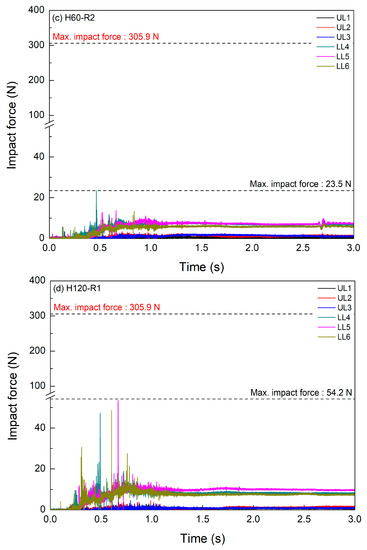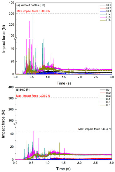 The impulse load induced by boulders is an important parameter for designing debris flow countermeasures [4,26]. Figure 7 shows a comparison of impact force on the terminal rigid barrier versus time during the experiment, and the impact force was measured under various baffle configurations (H0, H60-R1, R2, and H120-R2, R2). The initial response of the rigid barrier against debris flow impact was set to t = 0.25 s, and the total testing time was 3.0 s. The peak values of the impact force are also marked in each figure. We further investigated the importance of the dynamic and static components of the total impact load recorded at the load cells versus the time. The peak impact force of the debris flow on the terminal rigid barrier showed a distinct change with changes in the baffle configuration. The lower plates of the rigid barrier showed a greater impact force than the upper plates because the debris flow was mainly concentrated at the bottom of the rigid barrier. The case with no baffles (H0) exhibited the largest peak impact force because of the absence of the interference of baffles. Meanwhile, from the case with one and two rows of baffles, a rapid reduction in impact force was observed at the rigid barrier. Figure 8 shows a comparison of the dynamic peak impact force change for all the tests. One row of baffles (H60-R1) exhibited a 85% impact force reduction compared with the case with no baffles. Two rows of baffles (H60-R2) created an additional 47% impact force reduction compared with one row of baffles (H60-R1). This was because the additional staggered row of baffles produced a greater reduction in the gradual mobility of boulders and in the velocity of debris flow through the repeated suppression of the flow. The taller baffles in one row (H120-R1) exhibited an 82% impact force reduction compared with the case of no baffles; however, the impact force showed a negligible difference compared with the case with the shorter baffles (H60-R1). This was because the installed baffles temporarily suppressed the mobility of the boulders, whereas the flow freely passed between baffles without any interference after the baffles. However, increasing the baffle height from 60 mm (H60-R2) to 120 mm (H120-R2) with two rows of baffles decreased the impact force by up to 43%. As observed in previous studies on the debris flow dynamics with baffles by numerical analysis [27,28], the velocity and the impact force of flow significantly decreased with the increase in height and row number of baffles due to the increased flow impedance of baffles. Thus, the energy dissipation of the flow becomes even more obvious for higher heights and more rows of baffles. Figure 9 shows a comparison between the residual static impact force at various locations of the rigid barrier. Because of the formation of dead zones behind the rigid plate, the static force of the lower plates (LL4, LL5, and LL6) was much higher than that of the upper plates (UL1, UL2, and UL3). However, the static force in each test showed relatively few differences compared to the impact force. Comparing the results of the static force and the dynamic force, the baffle arrays had a major effect on the reduction in the dynamic force, while the baffles did not have a significant effect on the dead zone formation and the resultant lower reduction in the static force. As observed in the series of tests, the formation of dead zones for all the tests were similar regardless of the presence of baffle arrays.