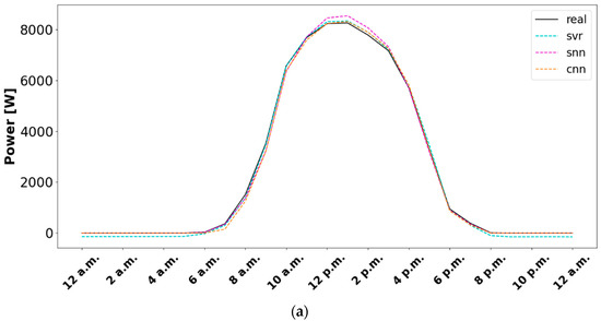 As can be seen in Figure 7, the adjustments of the SVR, SNN, and CNN models are not so good in the test set, generating underpredictions. So, as can be seen in (a), from 10 a.m. to 3 p.m., where the mean errors are 3.05% in SVR, 3.49% in SNN, and 2.78% in CNN, and in (b), from 1 p.m. to 4 p.m., with mean errors of 4.08% in SVR, 5.87% in SNN, and 4.47% in CNN, neither model fits the real data perfectly. In this case, i.e., the test set, the SVR continues to underpredict the nights, where the mean error is 1.50%, meanwhile the other two models continue having no error. The SNN model has slightly worse forecasts than SVR and CNN models during nights.