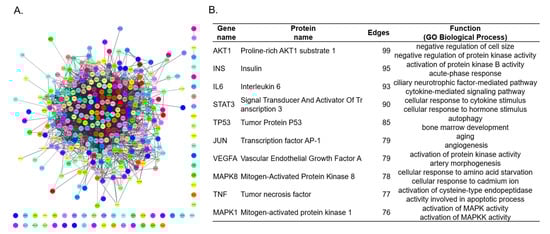 The LJ network was analyzed according to the degrees of nodes and edges to recognize the main targets and potential functions of LJ. The LJ network consisted of 359 nodes, which represent target genes, and 2891 edges, which represent their connections (Figure 1A). The top 10 genes with the highest edge degrees were AKT1, INS, IL6, STAT3, TP53, JUN, VEGFA, MAPK8, TNF and MAPK1 (Figure 1B). AKT1, the protein name for which is Proline-rich AKT1 substrate 1, had 99 edges, which indicates that AKT1 is associated with 99 other targets in the network. Based on the Gene Ontology (GO) Biological Process category database [], the functions of the top 10 genes were collected. ‘Negative regulation of cell size’ and ‘negative regulation of protein kinase activity’ were regarded as known functions of AKT1. INS, which is Insulin, had 95 edges in the network and was known to have ‘activation of protein kinase B activity’ and ‘acute-phase response’ functions based on GO Biological Process. In the same way, the protein names for and functions of other targets—IL6, STAT3, TP53, JUN, VEGFA, MAPK8, TNF and MAK1—were derived.