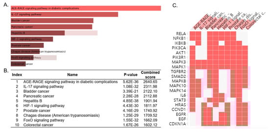 Functional enrichment analysis was conducted to investigate the LJ network to identify specific pathways. As a result of the enrichment analysis, the top 10 pathways related to the network were gathered: ‘Advanced glycation end products-Receptor for advanced glycation end products (AGE-RAGE) signaling pathway in diabetic complications’, ‘Interleukin 17 (IL-17) signaling pathway’, ‘Bladder cancer’, ‘Pancreatic cancer’, ‘Hepatitis B’, ‘Hypoxia-inducible factor 1-alpha (HIF-1) signaling pathway’, ‘Prostate cancer’, ‘Chagas disease’, ‘Forkhead box transcription factors (FoxO) signaling pathway’, ‘Colorectal cancer’ (Figure 2A). ‘AGE-RAGE signaling pathway in diabetic complications’ was predicted to be the most relevant pathway to LJ, with the lowest p-value (5.62 × 10−36) and the highest combined score (2640.65), both representing confidence in the correlation (Figure 2B). RELA, NFKB1, PIK3CA, AKT1, PIK3R1, MAPK3, MAPK1, TGFBR2, SMAD2, MAPK8, MAPK10, MAPK14, IL6, STAT3, HRAS and CCND1 were found to be genes related to both ‘AGE-RAGE signaling pathway in diabetic complications’ and the network of LJ (Figure 2C). ‘IL-17 signaling pathway’ and ‘Bladder cancer’ were presented with p-values of 1.08 × 10−32 and 3.39 × 10−21 and combined scores of 2311.98 and 2122.10, respectively.