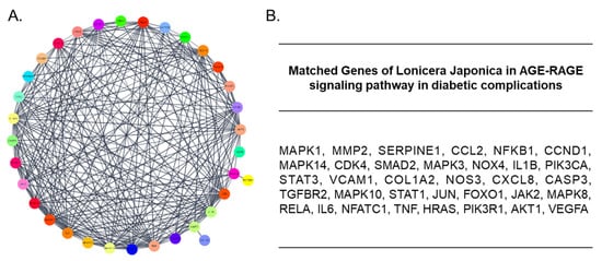 (A) The LJ network consisting of 34 nodes and 543 edges. (B) LJ genes matched with genes in the AGE-RAGE signaling pathway in the diabetic complications network (34 matched genes in total).