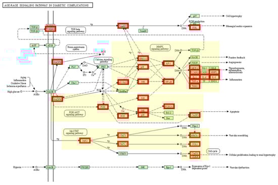 A diagram of the AGE-RAGE signaling pathway in diabetic complications. KEGG pathway: hsa04933. Matched genes are marked in red boxes.