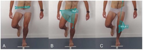 (A) Kinovea analysis of the contralateral pelvic drop angle; (B) Kinovea analysis of the femoral adduction angle; (C) Kinovea analysis of the knee valgus angle.