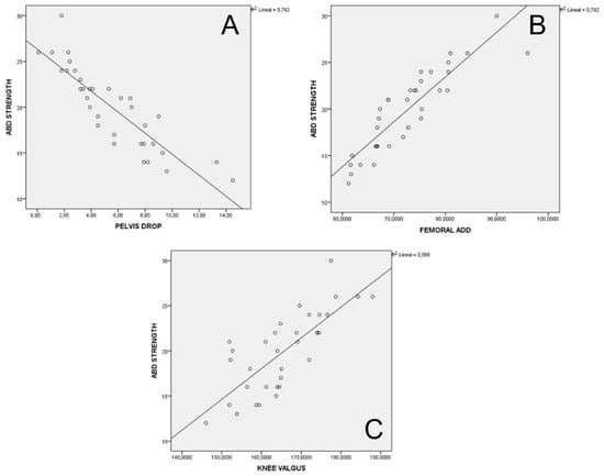 (A) Relationship between hip strength and contralateral pelvic drop. (B) Relationship between hip strength and femoral adduction. (C) Relationship between hip strength and knee valgus.