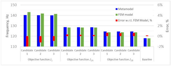 The maximum error was found for the metamodel with 10 parameters set and is equal to 2%. The results have been summarized Figure 22 and Table 8, showing candidates obtained from optimization processes together with a baseline for reference using validated FEM data.