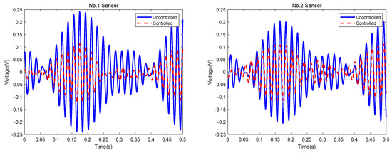 Figure 9 shows the sensor signals in the time domain. The root-mean-square (RMS) value was used to evaluate the sensor signals. A smaller RMS value generally means a weaker vibration. Table 1 shows the RMS values of the uncontrolled and controlled sensor signals. It was found that the RMS values were all reduced by more than 45%.