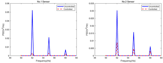 A superposition signal of 52 Hz, 55 Hz and 58 Hz sinuous signals was given to the vibration exciter. The control policy controls the actuators to reduce the vibration caused by the exciter. We simulated and compared the simulator sensor responses with or without control. The simulation time was as long as 30 s. For clarity, a short time span of 0.5 s is shown.